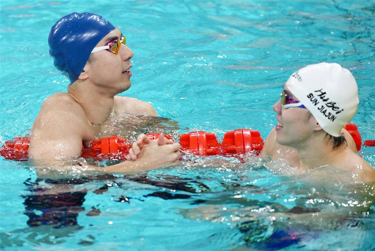 闫子贝(左)率队勇夺须眉4×100米夹杂泳竭力于于冠军。(新华社发)